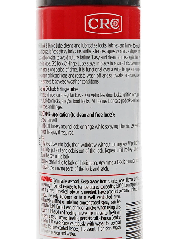 CRC Lock and Hinge Lube cleans and lubricates locks, latches and