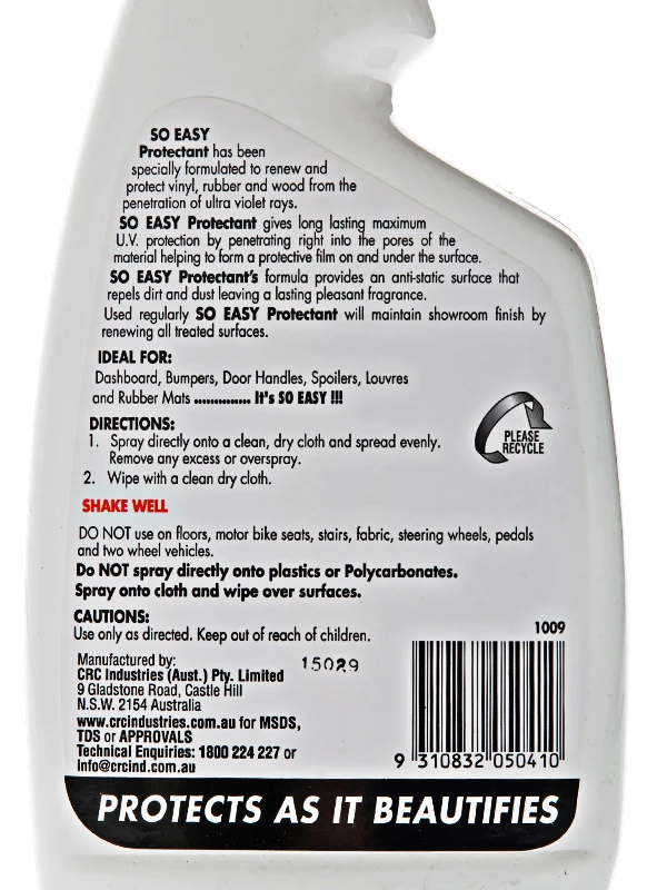 CRC So Easy Protectant is formulated to renew and protect vinyl,