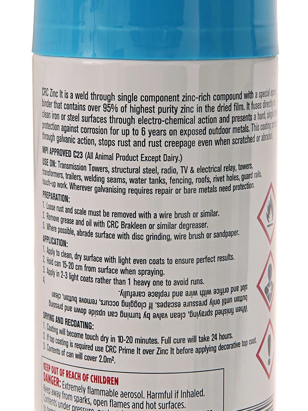 CRC Zinc It provides excellent cover and is capable to be applied as a heavy film for extra protection without forming runs. Delivered from a unique aerosol system giving a smooth even coat. Ongoing protection can be achieved through simple re-coating within 6 years, depending on conditions. Protection in extreme conditions may require re-application more frequently.